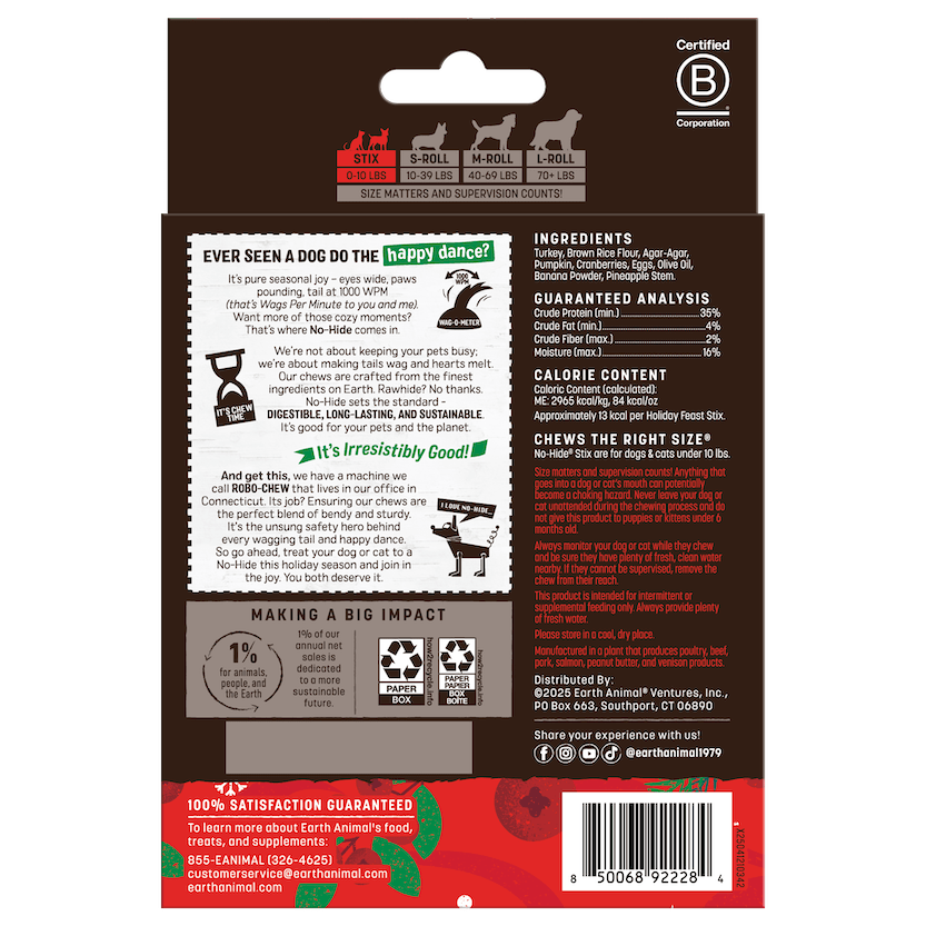 Earth Animal No Hide Stix Holiday Feast Recipe Dog Chews