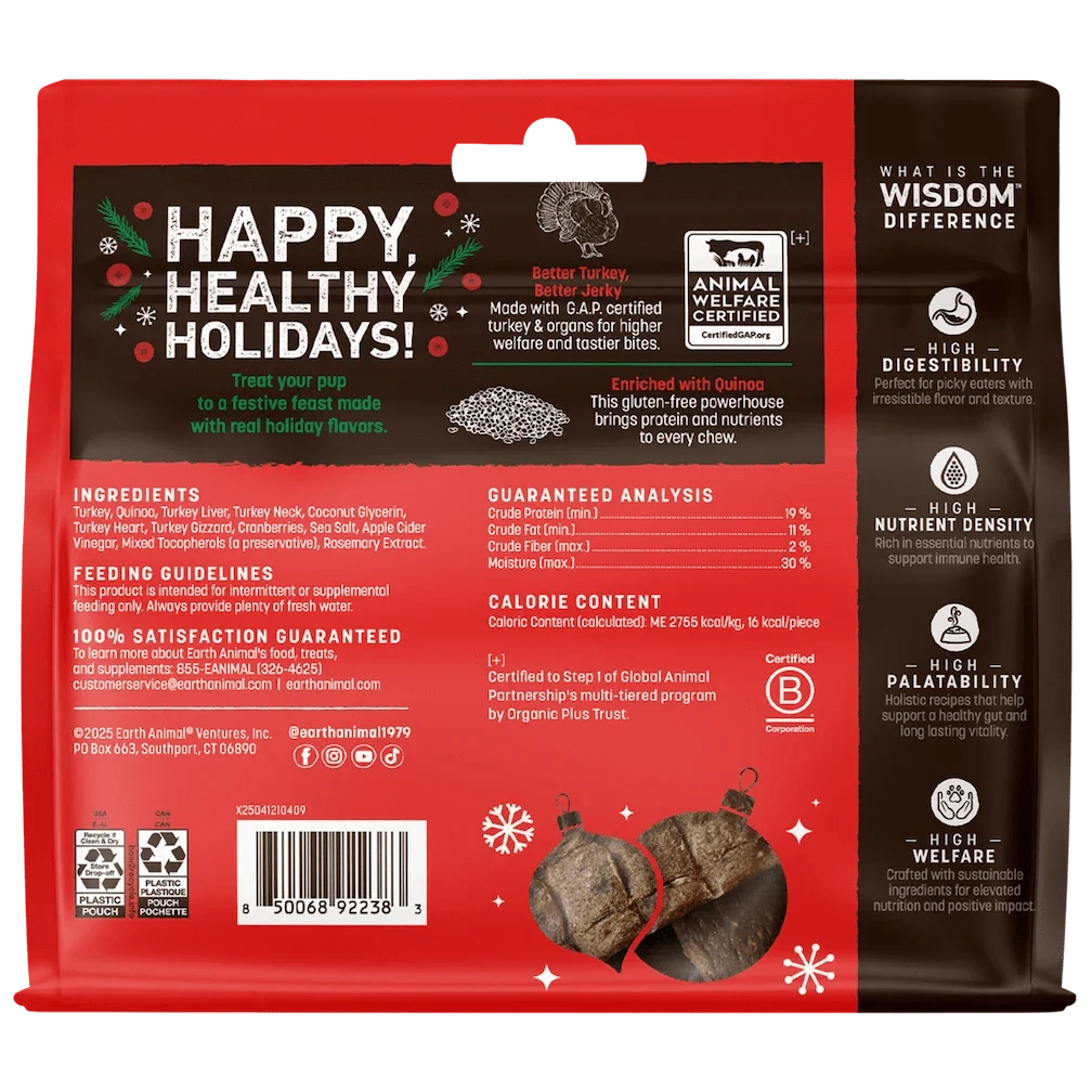 Earth Animal Wisdom Air-Dried Jerky is veterinary-formulated using a balance of high-quality ingredients that are cooked low and slow to lock in moisture and the natural, savory flavor that dogs crave. Made with our Signature Protein Blend of sustainably sourced, G.A.P. rated turkey muscle and turkey liver, neck, heart, & gizzard and festive cranberries to deliver superior nutrition & taste. Enriched with quinoa, an ancient grain. We air-dry low & slow to lock in moisture and natural, savory flavor dogs crave. The unique soft & chewy texture is cut into strips that can be broken into high value training treats. Great for picky dogs of all sizes & ages.