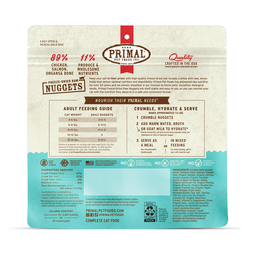 It’s easy to feed your cat real, whole foods that deliver optimal nutrition and digestibility with Primal Freeze-Dried Raw Nuggets. Our Chicken & Salmon Recipe freeze-dried raw cat food is free of synthetic vitamins and minerals. It’s made with cage-free chicken raised without antibiotics, steroids, or added hormones and wild-caught salmon. Simply portion, shred, and hydrate with warm water, Bone Broth, or Raw Goat Milk. Available in 5.5- and 14-ounce resealable bags.