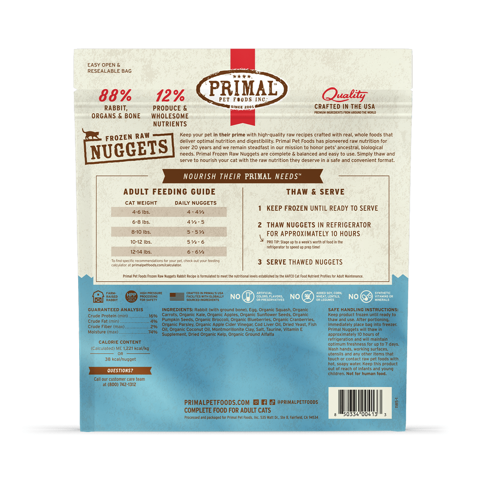 Nourish your cat’s primal needs with complete and balanced, easy-to-use Primal Frozen Raw Nuggets. Our Rabbit Recipe raw cat food features farm-raised, antibiotic-free rabbit raised without steroids or added hormones. There’s no need to grind, chop, measure, or mix. Simply thaw and serve as a meal or a mixer to keep your cat in their prime. Available in 3-pound resealable bags.